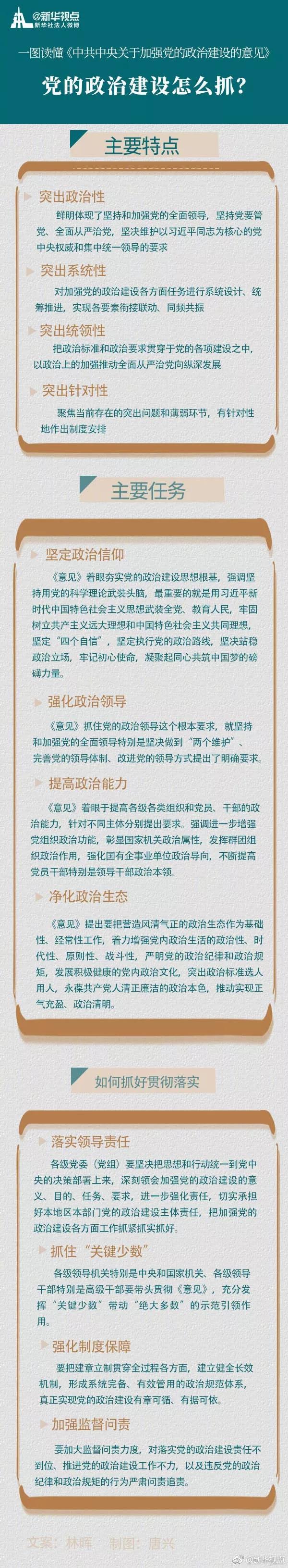 《意见》主要有4个特点:一是突出政治性。深入贯彻习近平新时代中国特色社会主义思想特别是习近平总书记关于加强党的政治建设重要指示精神,鲜明体现了坚持和加强党的全面领导,坚持党要管党、全面从严治党,坚决维护以习近平同志为核心的党中央权威和集中统一领导的要求。二是突出系统性。遵循党的政治建设规律和内在逻辑,整合党章、准则等党内法规制度有关规定,明确了加强党的政治建设的总体要求和主要任务,对加强党的政治建设各方面任务进行系统设计、统筹推进,实现各要素衔接联动、同频共振,全面提高党的政治建设水平。三是突出统领性。牢牢把握党的政治建设对党的各项建设的统领作用,注重统分结合、纲举目张,把政治标准和政治要求贯穿于党的各项建设之中,以政治上的加强推动全面从严治党向纵深发展。四是突出针对性。立足新时代党的政治建设新要求,聚焦当前存在的突出问题和薄弱环节,有针对性地作出制度安排,有的放矢、务求实效。同时,注重强调原则要求、明确标准底线,不过多涉及党的建设其他方面的具体问题。