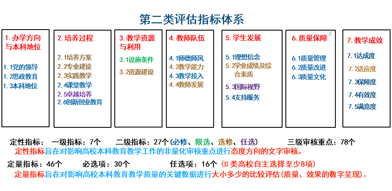 第二类第一种审核评估适用于已参加过上轮审核评估,重点以学术型人才培养为主要方向的普通本科高校。指标体系包括7个一级指标、27个二级指标和78个审核重点,设置统一必选项、类型必选项、特色可选项、首评限选项,形成三种不同的模块组合方案。