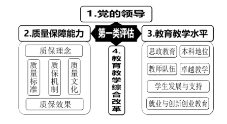 指标体系设计充分体现“两类四种”特征,有区分度和引导性。第一类评估指标体系包括4个 一级指标:党的领导、质量保障能力、教育教学水 平、教育教学综合改革。其中“党的领导”和“教育 教学综合改革”下未设二级指标。“质量保障能力”有5个二级指标:质保理念、质量标准、质保机 制、质量文化、质保效果。“教育教学水平”有6个 二级指标:思政教育、本科地位、师资队伍、卓越教 学、学生发展与支持、就业与创新创业教育(见图 3)。